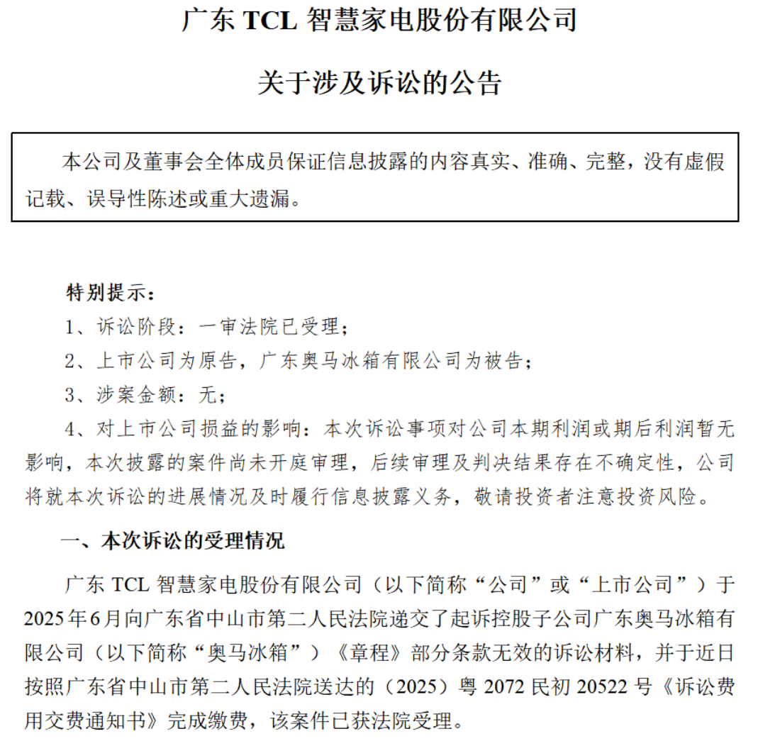 对于本次诉讼对于公司治理的影响,TCL智家在公告中表示,诉讼仅针对奥马冰箱公司章程中关于非职工代表董事更换的相关条款进行调整,不涉及TCL智家所持奥马冰箱股权或表决权的归属或处分,不会导致TCL智家丧失其持有的奥马冰箱半数以上的表决权,不影响公司在奥马冰箱的控股股东地位,也不会导致TCL智家合并范围发生变化。同时,TCL智家也表示了对奥马冰箱当前经营管理团队的认可。